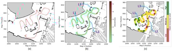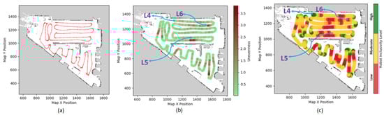 (a) A 2D LiDAR map of the study area and path taken by the audit robot; (b) recorded unevenness variation as a heatmap; (c) resultant RIL-SU heatmap for the site.