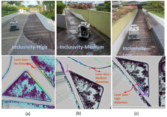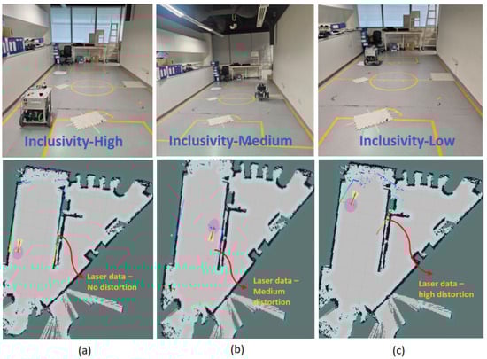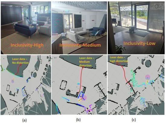 Finally, at location ‘L6’ in Figure 7c, there were multiple uneven bumpy tiles placed in this zone. The U in this zone was higher (see Figure 6b), and the inclusivity was tagged as low (see Figure 6c). The Meerkat robot laser scan drifted by a higher range once the robot tried to traverse across this zone (see Figure 7). It implies the robot’s ineffectiveness in reaching its destination coordinates indicating ‘Low’ inclusivity. The results are in agreement with the generated RIL-SU heatmap.