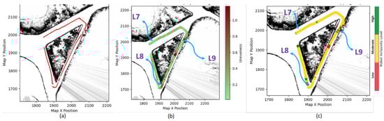 To validate the RIL-SU heatmap, three different zones with different RIL-SU values were selected in the site similar to the previous experiment. The selected zones are represented as ‘L7’, ‘L8’, and ‘L9’ in Figure 8b,c. The robot was made to pass through the selected locations at its nominal speed and also made to run multiple times around each zone. At location ‘L7’, the cementitious material holds enough friction between the wheels and the floor for the robot not to undergo slippage and produce any jerk. Hence, the unevenness of the surface is low, which is replicated in Figure 8b. While experimenting at L7, the Meerkat robot mapping and localization were precise, and there were no navigation issues as seen in Figure 9a, which indicates the robot’s high inclusivity in this zone. This validates the High RIL in Figure 8c.