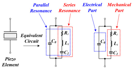 The piezo element can be expressed as an equivalent model consisting of the R 1 L 1 C 1 series circuit part that affects the mechanical output and the parasitic capacitor C 0 , as shown in Figure 1. The first arm is an electrical arm that includes the parasitic capacitor C 0 , and the other arm is a mechanical arm consisting of the dynamic capacitor C 1 , the dynamic inductor L 1 , and the dynamic resistor R 1 . As can be seen from the equivalent model above, the piezo element has a structure with two resonance points, as shown in the equation below as (1), (2) [21,22].