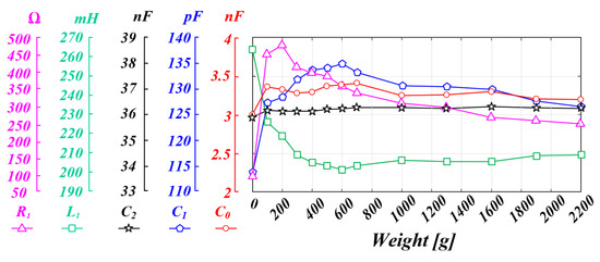 Although L 1 and C 1 of the piezo element are values that change depending on the pressure, the simulation was conducted by setting the parameter values for each in order to express them in the graph. However, in the graph of Figure 8, L 1 and C 1 change in a monotonically increasing pattern.