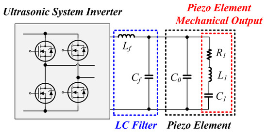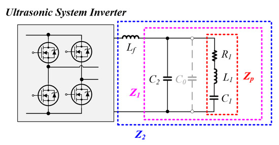 Figure 3 is the equivalent circuit of the inverter output stage in the ultrasonic system, and can be interpreted as the equivalent circuit of the entire system. As shown in Figure 3, the parasitic capacitor C 0 of the piezo element and the capacitor C f of the L C filter are connected in parallel, so they can be considered as one capacitor C 2 . Since L f and C f of the L C filter are values designed by the user, they are fixed values that do not change, and the parasitic capacitor C 0 of the piezo element has very little change in value and is almost constant [13,26,27,28,29].
