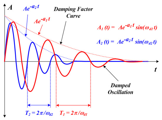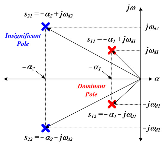 As shown in Figure 6 above, there are poles with different real part sizes and frequency characteristics in the s-plane due to the transfer function of the fourth-order system [31,32]. At this time, if the real part ( α 2 ) of the pole located farther from the imaginary part among the two poles is 5 to 10 times larger than the real part ( α 1 ) of the pole closer to the imaginary part, it can be distinguished as a dominant pole and an insignificant pole [33]. In general, the transient response characteristics of the insignificant pole show fast damping while the dominant pole has a characteristic of relatively slow damping, and the characteristics of this are shown in Figure 7. Using these characteristics, we tried to detect the entire system resonance frequency of the ultrasonic system and find the mechanical resonance frequency of the piezo element through this. The proposed resonance frequency tracking method is summarized as follows. When voltage is applied to the ultrasonic system, a transient phenomenon in the form of under-braking occurs due to the exchange of the magnetic energy and electrostatic energy of the inductor and capacitor [30]. At this time, the transient phenomenon of the fourth-order system applied in this system appears with the damping characteristics and resonance frequency due to the dominant and insignificant poles. After the damping of the insignificant pole with relatively fast damping characteristics is completely achieved, only the damping characteristics and resonance frequency due to the dominant pole exist. At this time, the resonance frequency refers to the resonance frequency due to the inductor and capacitor components included in the entire ultrasonic system. In addition, the resonance frequency of the entire system according to the parameter value change of the piezo element was simulated and verified, and the mechanical resonance frequency of the piezo element was found through this. The resonance frequency of the entire system of the ultrasonic system output stage and the mechanical resonance frequency of the piezo element can be analyzed through a mathematical formula, Equation (6) mentioned above, and the characteristic equation calculation. This process consists of calculating the characteristic equation, calculating the characteristic root, calculating the damping period and the vibration period, and calculating the resonant frequency. The following are the formulas for the ultrasonic system output terminal and the piezo element.