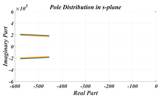 Figure 8 is an s-plane graph according to the pressure fluctuation of the piezo element. The result is that the characteristic root is plotted by assigning different colors to each C 1 value and maintaining the same color for the L 1 value. The L C filter value is a fixed value determined during the design of the ultrasonic system, and the graph shows the case where the values fluctuate from L 1 190 to 240 mH and C 1 120 to 140 pF in the equivalent model of the piezo element. As the value of inductor L 1 increases, the real part value of the x-axis moves toward 0. As the value of capacitor C 1 increases, the imaginary part value of the y-axis moves toward 0. In the graph, blue is when the capacitor value is 120 pF, red is 130 pF, and yellow is 140 pF. And the inductor value at this time ranges from 190 to 240 mH. The range is the range of the minimum and maximum values measured at L 1 and C 1 when pressure is applied to the piezo element. As shown in Figure 8, it can be separated into the dominant and insignificant poles, and the insignificant pole showed a distribution diagram like the graph in Figure 8 according to the parameter value fluctuation of the piezo element.