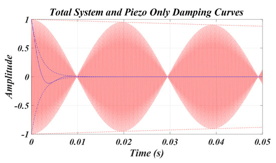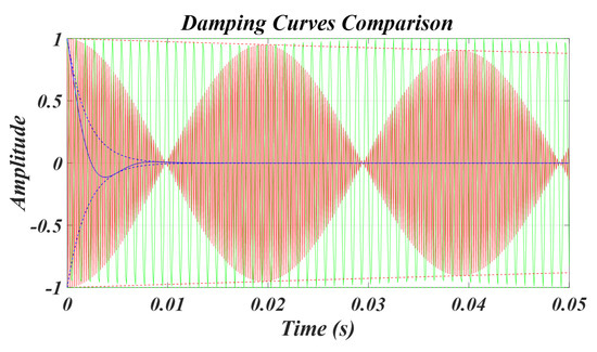 Figure 9 and Figure 10 are the damping characteristic graphs of the ultrasonic system and piezo element. According to the conditions in Table 1, the characteristic equation, characteristic root, damping period, vibration period, and resonance frequency are calculated, and these are shown in the graphs of Figure 9 and Figure 10. The red graph in Figure 9 shows the output stage of the ultrasonic system, including the piezo element and L C filter, and the blue graph shows the damping curve and envelope of the piezo element, excluding the parasitic capacitor C 0 . Figure 10 shows the damping curve and envelope of the piezo element, including the L C filter and parasitic capacitor C 0 , added to Figure 9. The green color is a damping graph for the L C filter only. If a simulation is performed with L 1 190, 240 mH and C 1 120, 140 pF, which are the minimum and maximum value ranges according to the pressure fluctuation of the piezo element, data can be obtained that can estimate the characteristics of the ultrasonic system resonance frequency and the mechanical resonance frequency of the piezo element.