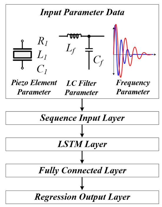 Through the above process, the resonance frequency of the ultrasonic system output terminal and the piezo element can be analyzed. As a result, the circuit characteristics that exist in the ultrasonic system output terminal, including inductor components and capacitor components, will exhibit nonlinear characteristics. In addition, the mechanical resonance frequency of the piezo element does not have linear characteristics due to the fluctuation in the L 1 and C 1 values of the piezo element. Therefore, an algorithm that can estimate the nonlinear mechanical resonance frequency of the piezo element based on data on the ultrasonic system resonance frequency is required. In this study, a method that can estimate the characteristics of the entire mechanical resonance frequency range of the piezo element is proposed using an LSTM model suitable for analyzing the nonlinear characteristics of the piezo element. This was estimated using MATLAB simulation and the LSTM model, and the system was operated using the corresponding frequency and verified through experiments.
