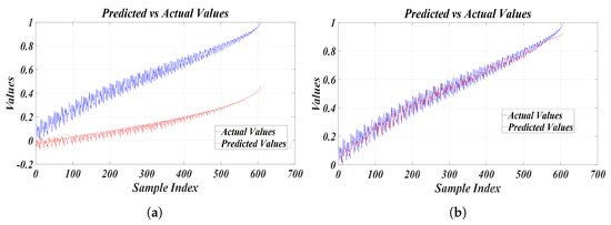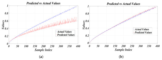 Figure 13 and Figure 14 show the results of MATLAB learning simulations to estimate the relationship between the entire system frequency and the mechanical resonance frequency of the piezo element through regression analysis using a nonlinear regression model and an LSTM model. The ultrasonic system resonance frequency on the x-axis in Figure 11 can be seen to be divided into right and left sections based on 30 kHz due to nonlinear characteristics. Therefore, the right resonance frequency section was divided into 1 and the left resonance frequency section was divided into 2, and the analysis was conducted using the LSTM model. As a result, the characteristics of the entire mechanical resonance frequency range of the piezo element were estimated using the LSTM model. Figure 13a shows the estimation of the mechanical resonance frequency of the piezo element using a nonlinear regression model for Section 1, and Figure 13b shows the estimation of the mechanical resonance frequency of the piezo element using the LSTM model, respectively. Figure 14a shows the estimation of the mechanical resonance frequency of the piezo element using the nonlinear regression model for Section 2, and Figure 14b shows the estimation of the mechanical resonance frequency of the piezo element using the LSTM model, respectively. In order to improve the learning accuracy of the two models, the min-max normalization of the data set was applied as a preprocessing step. The configuration of LSTM was set to the number of input dimensions 1, the number of hidden units 200, the number of epochs 200, and the batch size 100, as shown in Table 2. As a result of analyzing the frequency relationship, the RMSE (Root Mean Square Error) of the nonlinear regression model was 0.1922 and the RMSE of the LSTM model was 0.0124. It was confirmed that the LSTM model showed a significantly lower RMSE value than the nonlinear regression model, providing more precise results for estimating the resonance frequency of the piezo element. This is interpreted as because the LSTM model effectively captures the long-term dependency of time series data and can better model the complex nonlinear behavior of the piezo element.