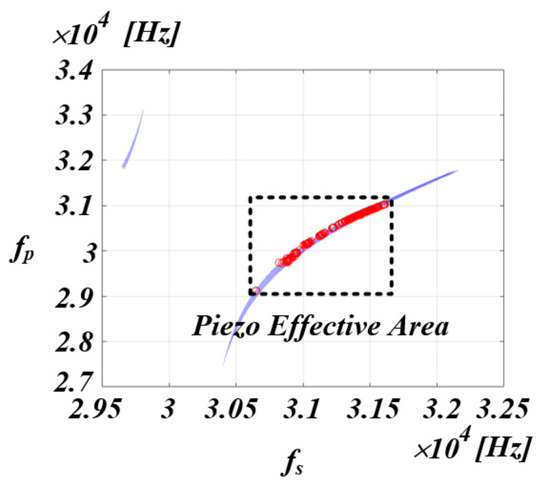 The resonant frequency ( f r ) of the R 1 L 1 C 1 series circuit of the mechanical arm is organized as in (1), and this becomes the mechanical resonant frequency that delivers the maximum power to the piezo element. And, the total resonant frequency ( f a ) of the piezo element including the parasitic capacitor C 0 is organized as in (2). In other words, the piezo element exists in a form where both the resonant frequency and the anti-resonant frequency exist due to the influence of the parasitic capacitor C 0 . Therefore, if the system is operated with an incorrect resonant frequency, the output may not be properly delivered to the piezo element due to the influence of the anti-resonant frequency. Therefore, in order to accurately deliver the output to the piezo element, the system must be operated with the mechanical resonant frequency ( f r ), such as (1), that can deliver the maximum power [23,24,25].
