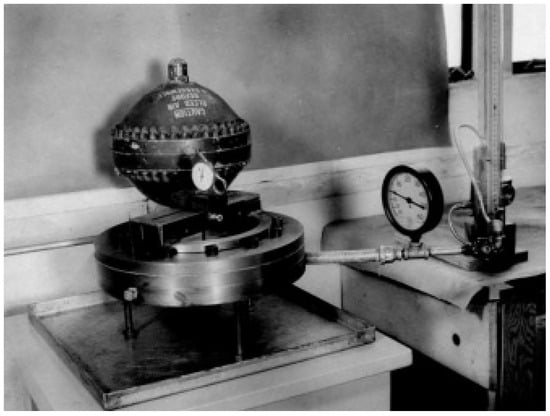 In August 1954, a paper entitled “National Advisory Committee for Aeronautics, Technical Note 3212” [9] was published in the journal. “A nonlinear theory of bending and buckling of thin elastic shallow spherical shells”, whose authors were Abner Kaplan and Yuan-Cheng Fung. This work contained both theoretical considerations and the results of the experimental studies conducted. These tests were conducted on a series of shallow spherical shells with a base radius of 4 inches, nominal shell radii of curvature of 20 and 30 inches, and shell thicknesses ranging from 0.029 to 0.102 inches. The shells were rigidly fixed in the base and composed of a material designated QQ-M-44, which is a magnesium alloy. The material parameters were elastic modulus E = 6.5∙106 psi and Poisson’s ratio v = 0.32. The shell fabrication process was based on the “spinning” method, which involves rapidly rotating a flat sheet of metal while forming the curvature of the shell. Two types of pressure gauges were used in the study: a mercury gauge to measure pressures below 20 psi and a Bourdon tube gauge to measure when pressures exceeded 20 psi. The view of the test fixture is shown below in Figure 1.