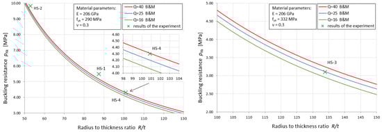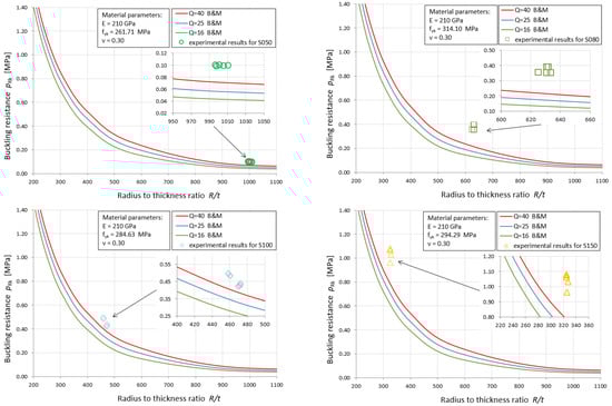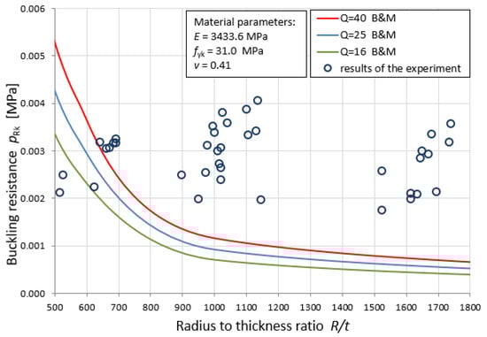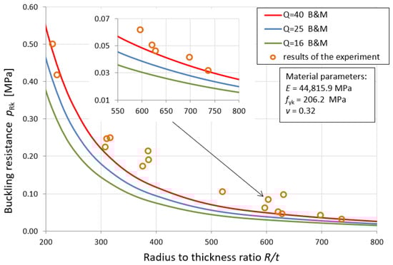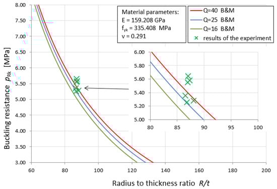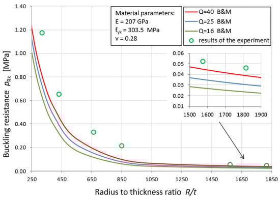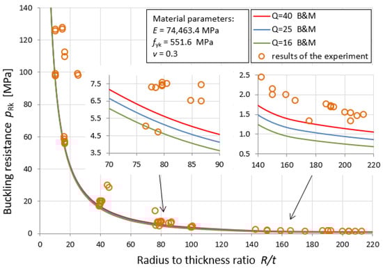 The comparison of the experimental results (Figure 6) with the proposed B&M calculation procedure shows that the buckling phenomenon of real spherical shells was very well described by the calculation formulas. The experimental results were slightly higher than all three buckling capacity curves for the fabrication quality parameters Q = 16, 25, and 40. Only two out of the fifty-nine tested specimens showed buckling capacities lower than the curves for Q = 25 and 40, but they were still higher than the curve corresponding to the worst class of fabrication quality, that is, Q = 16.