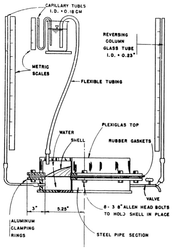 The tested shells were composed of 7075-T6 aluminum with material parameters as follows: yield strength fyk = 80,000 psi, elastic modulus E = 10.8∙106 psi, and Poisson’s ratio v = 0.30. A tool specifically designed to accurately generate internal spherical surfaces was used to generate the internal contours. The spherical shell and support ring of each model were composed as a unit. All the samples were subjected to hydrostatic pressure, which was gradually increased at one-minute intervals until the tested shell buckled. The pressure value at the point of buckling was read and considered the critical pressure. A schematic of the test stand is shown in Figure 5 below.