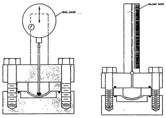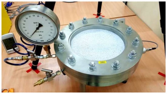 The main component of the test stand was a pressure chamber, shown in Figure 9. A strain gauge pressure transducer coupled to a computerized recording unit was used to measure the pressure in the chamber. A non-contact optical displacement measurement system was used to measure displacement. The details of the test apparatus and measuring station are presented in [13,14].