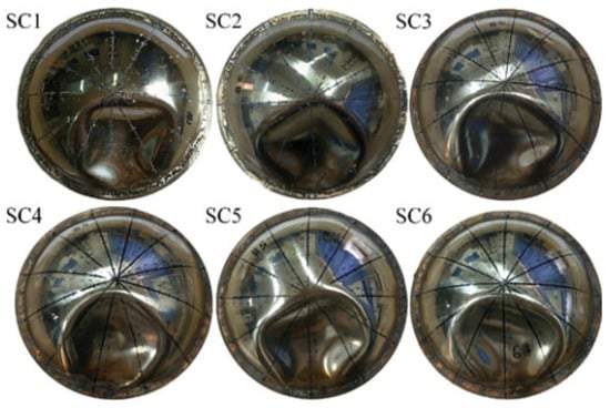 After the initial measurements, the samples were slowly pressurized to destruction in a cylindrical pressure chamber at Jiangsu University of Science and Technology. The chamber has an inner diameter of 200 mm, an overall length of 400 mm, and a maximum pressure of 20 MPa, with water as the pressure medium. The pressure inside the chamber was recorded with a pressure transducer; the pressure was applied slowly in ∼0.1 MPa increments. The exact process of loading and conducting the test is described in [6,7]. The effect of the experimental tests regarding the form of spherical shells that buckled is shown in Figure 12.