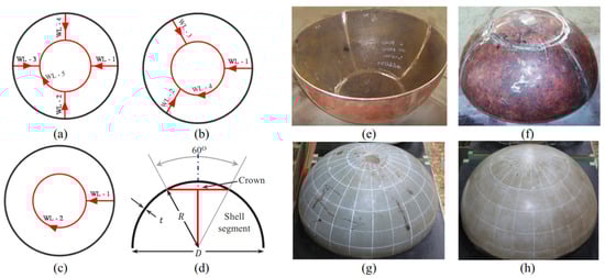 The welding diagram and photos of the spherical shells prepared for testing are shown in Figure 14. Models HS-1 and HS-4 consist of four segments and one crown. Model HS-2 has three segments and one crown. Finally, a single shell segment was used in model HS-3. All the test models are composed of SS41 mild steel. Details of the determination of the material parameters of the tested shells are provided in [8].