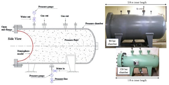 The experimental tests were conducted at the Ultimate Limit State Analysis Laboratory (ULSAN Lab) at Ulsan University. Each model was measured for initial imperfections and thickness. Measurements were completed with a proprietary instrument on a rotary table with a dial gauge. For thickness measurement, an ultrasonic meter was used. All the spherical shell models except HS-2 were tested in a pressure chamber with an inner length of 2.8 m and a diameter of 1.3 m. The maximum pressure in this chamber can be 80 bar. The HS-2 model, for which the highest buckling capacity was expected, was tested using a chamber with an inner length of 1.8 m and an inner diameter of 0.65 m, in which a pressure of 120 bar is possible. Figure 15 shows a schematic of the test stand and a view of the two pressure chambers.