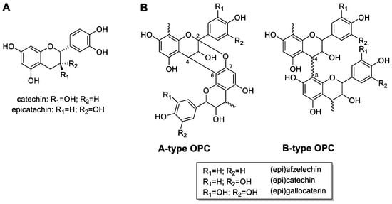 The major group of OPCs are the procyanidins, which are formed of (epi)catechin monomeric units (Figure 1A). Less abundant are the prodelphinidins, which consist of (epi)gallocatechin units and the propelargonidins, which are composed of (epi)afzelechin monomers [12]. Due to the different monomers from which the OPCs can be composed and the two possible types of linkage between the subunits, OPCs have a very large structural diversity. Another factor for the huge diversity of this substance class is the different DP.