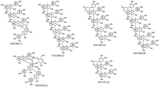 Depending on the MS2 data and the exact mass of the OPCs, it was possible to forecast the structures of six new OPCs in Aronia × prunifolia ‘Nero’, which are shown in Figure 3. The structures were determined by fragmentation mechanisms, which are described for OPCs in the literature. These mechanisms are the retro-Diels–Alder reaction (RDA), quinone methide (QM) cleavage and heterocyclic ring fission (HRF).