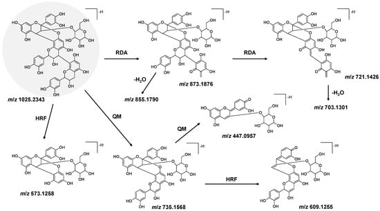 Presumed fragmentation pathway of the cinchonain tetramer found in Aronia × prunifolia ‘Nero’ with HRMS in negative ionization mode. The fragmentation mechanisms involved mainly retro-Diels–Alder reaction (RDA) and quinone methide cleavage (QM).