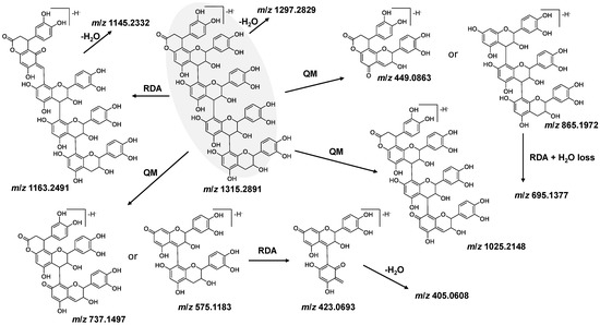 The m/z 1315 ion is proposed as a cinchonain tetramer (Figure 3 (5)). Therefore, the fragmentation pattern of m/z 1315 is delved into in more detail to confirm the proposed structure (Figure 5). Based on the predicted molecular formula C69H55O27 ([M-H]−), it is expected that the cinchonain included only B-type linked (epi)catechin subunits along with a phenylpropanoid moiety.