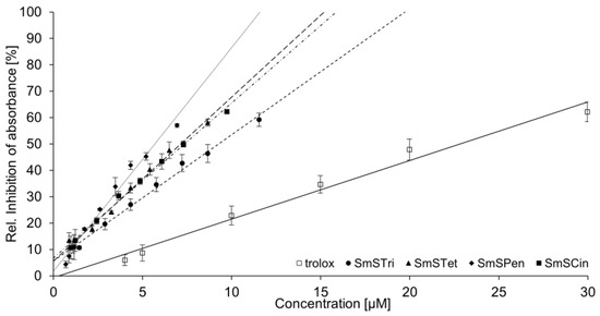 Linear regression plots of the TEAC assay. Relative absorbance inhibition through Trolox (white square), SmSTri (circle), SmSTet (triangle), SmSPen (diamond) and SmSCin (black square) with each linear regression.