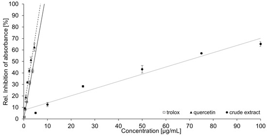 Results for the crude extract and quercetin were calculated in the same manner, with linear regressions and coefficients of determination R2 > 0.95. These results are presented in Figure 8. All calculated TEAC values are shown in Table 2.