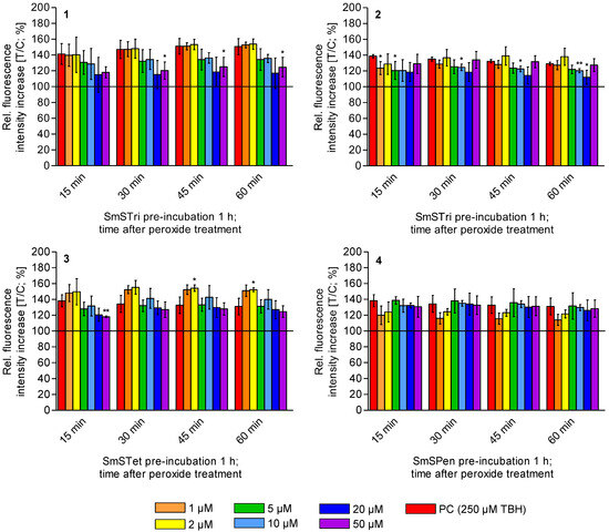 An antioxidant potential could not be proven for all tested compounds, as it was the case in the cell-free TEAC assay. Only SmSTri, SmSCin and SMSTet show antioxidant effects. SmSTri and SmSTet display concentration-dependent antioxidant effects over the time period of 60 min. For SmSTri (Figure 9 (1)), a significant effect occurs at the highest concentration of 50 µM at the time points of 30, 45 and 60 min. The clearest concentration dependency for this compound is after a short incubation period of 15 min with TBH. With time, the relative fluorescence of the PC and the test analytes become more and more similar, for the lower concentrations. SmSTet (see Figure 9 (3)) shows similar effects as SmSTri, whereby a significant antioxidant effect was observed at 50 µM and 15 min after TBH incubation. An overall reduction in the relative fluorescence intensity increase could be observed over the displayed time period for this compound. In addition, further significant effects occur at a concentration of 20 µM and 60 min as well as 1 µM and 5 µM after 10 min incubation with TBH (Figure 9 (2)). Concentration-dependent effects are not as pronounced with SmSCin as with SmSTri and SmSTet. At the highest concentration of 50 µM, there is hardly any reduction in the relative fluorescence intensity increase. No significant antioxidative effects were observed for SmSPen (Figure 9 (4)) over the entire duration. For the two lowest concentrations, however, visible antioxidant effects occur over the entire period.