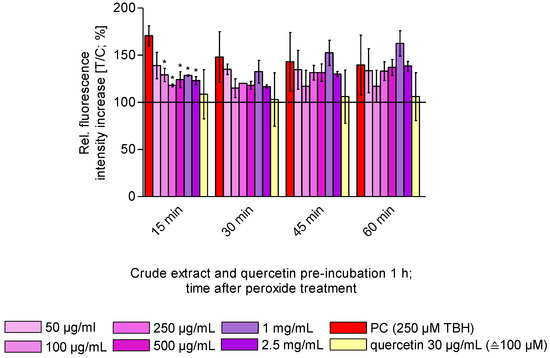 The highest antioxidant properties of the crude extract was develop 15 min after ROS induction. At the concentrations 100 µg/mL, 250 µg/mL, 500 µg/mL, 1 mg/mL and 2.5 mg/mL, the statistical significance of the effect after 15 min is confirmed by using Student’s two-way t-test. Antioxidant effects could still be observed for the mid-range concentration used, 30 min and 45 min after peroxide incubation, although not significantly detectable. For the control substance quercetin, a decrease in the relative fluorescence intensity was observed over the entire time course. A statistically significant reduction was confirmed after 10 min using Student’s two-way t-test. This confirms the functionality of the modified DCFH2-DA assay.