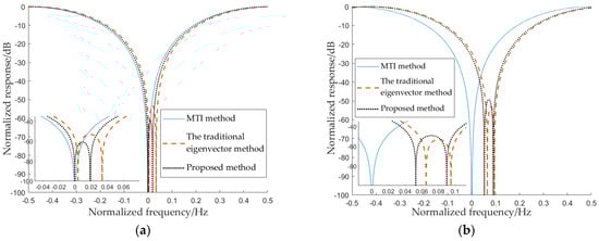 Figure 6a shows the filter response curves of the three methods when the target is located in the 23rd range cell. The MTI three-pulse canceller generates a notch at the zero frequency, and the depth of the notch meets the need for clutter suppression, but the width of its zero-frequency notch is insufficient to completely filter out the clutter. The traditional eigenvector method produces a notch at the center of the corresponding clutter frequency to suppress the clutter under the prediction of clutter information, which can completely filter out the clutter but inevitably loses part of the signal energy. The method proposed in this paper explores and exploits the same predicted clutter spectrum near the center, optimizes the parameter settings of the filter, and changes the filter width. It can be seen that the filter notch designed by the method proposed in this paper is much narrower and is able to completely suppress the clutter while having a higher amplitude-frequency response to signals at non-clutter frequencies, thus reducing the loss of the target signal. In Figure 6b, the conventional eigenvector method produces a notch near 150 Hz, on which the proposed method further optimizes the filter notch width and position to suppress clutter while reducing the target signal loss, while the three-pulse cancellation still produces a notch at the zero frequency, which is unable to suppress the non-zero-frequency clutter.
