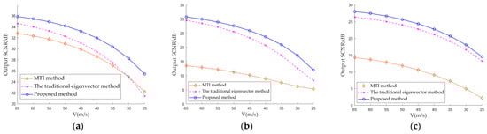 In order to further investigate the effect of different target velocities on the filter performance, three sets of experiments are conducted in this section to simulate clutter with different clutter center frequencies, varying the velocities added to the simulated targets. The experimental parameters and simulated clutter parameters are shown in Table 5 and Table 6. The SCNR comparisons of the three methods at different speeds are shown in Figure 7.