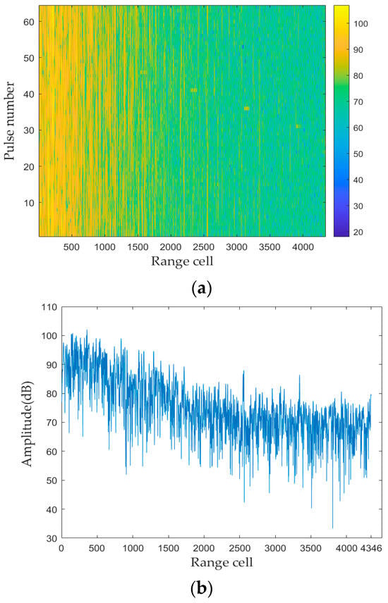 Radar echo image before clutter suppression. (a) Two-dimensional echo signal view; (b) range dimension image of the first pulse.