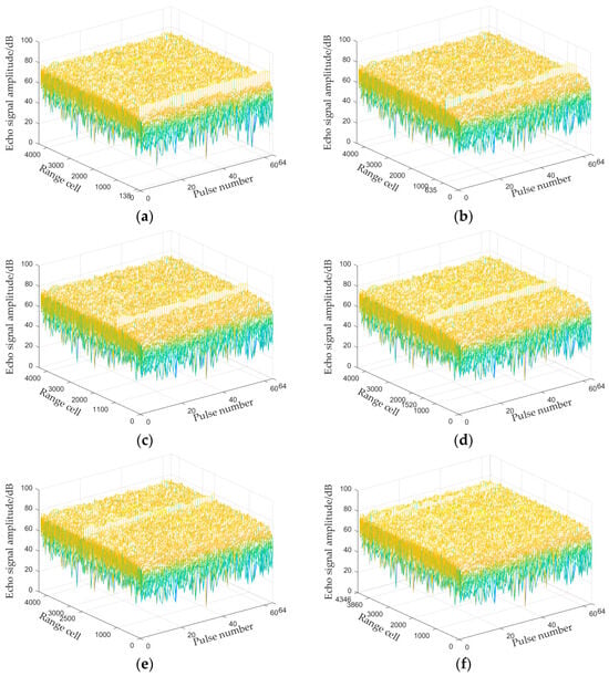 Three-dimensional view of the proposed method after clutter suppression. (a) The simulation target is located at the 138th range cell. (b) The simulation target is located at the 635th range cell. (c) The simulation target is located at the 1100th range cell. (d) The simulation target is located at the 1520th range cell. (e) The simulation target is located at the 2500th range cell. (f) The simulation target is located at the 3860th range cell.