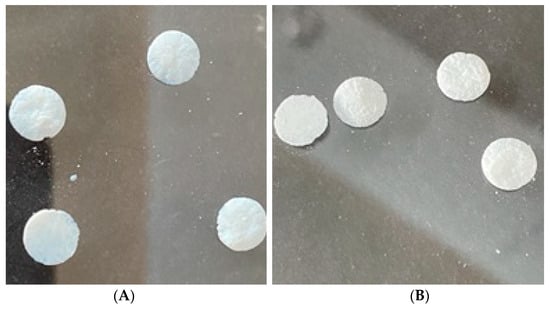 Photographic images of the tested biomaterials in the form of pellets obtained prior to the sterilisation process. The synthesis of the materials did not include any surfactants. The weight of each was 0.1 g, with 6 mm in diameter and 2 mm in height. The Trystom H-62 hand press (Olomouc, Czech Republic) was used to prepare the materials in the form of pellets. (A)—nHAp; (B)—nFAp.