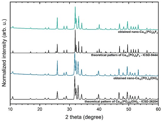 The XPRD patterns of the Ca10(PO4)6(OH)2 and Ca10(PO4)6F2 nanopowders compared to the theoretical patterns of HAp and FAp.