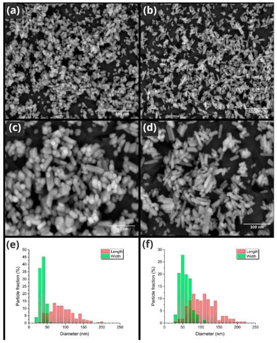 The morphology of the apatites, determined by the SEM technique, is shown in Figure 3. The grains possess an elongated shape with well-defined edges and grain boundaries. The morphology of the materials obtained by the hydrothermal method is rod-like, and the size is in the nanoscale range. The particle size distributions of the studied systems were measured based on SEM images and are presented as histograms (Figure 3e,f). The average grain size of the Ca10(PO4)6(OH)2 powder is 56 nm in width and 107 nm in length, while the Ca10(PO4)6F2 powder is 37 nm in width and 92 nm in length.