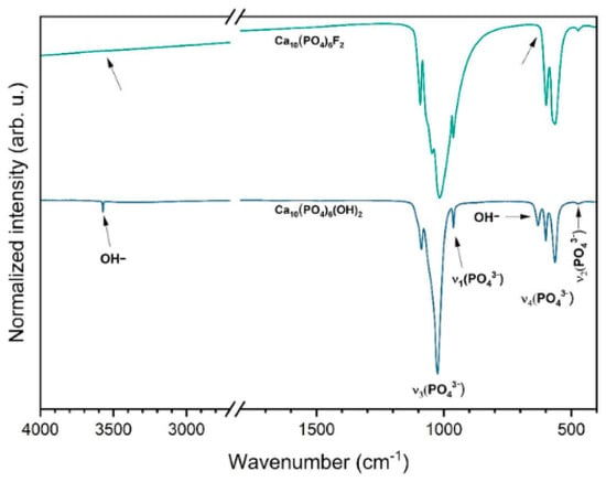 The FT-IR spectroscopy was employed to identify the existence of functional groups in the obtained materials (see Figure 4). We identify typical vibrational bands of the phosphate groups in FT-IR spectra of the nHAp nanosized powder: the doubly degenerated v2 bending at 472 cm−1, the triply degenerated ν4 vibration at 564 cm−1 and 600 cm−1; the non-degenerate ν1 symmetric stretching at 962 cm−1; and the triply degenerate ν3 antisymmetric stretching at 1025 cm−1 and 1088 cm−1. Moreover, the stretching and librating modes of hydroxyl groups at 630 cm−1 and 3572 cm−1 are present in the IR spectra, indicating that HAp was formed. In the case of FAp, typical vibrational bands of phosphate groups were also identified: the doubly degenerated v2 bending at 472 cm−1, the triply degenerated ν4 vibration at 564 cm−1 and 598 cm−1; the non-degenerate ν1 symmetric stretching at 963 cm−1; and the triply degenerate ν3 antisymmetric stretching at 1017 cm−1, 1046 cm−1 and 1092 cm−1. No vibrations were found at about 3560 and 630 cm−1 (see arrows in Figure 4), characteristic of the hydroxyl groups, confirming the formation of a pure nFAp structure.