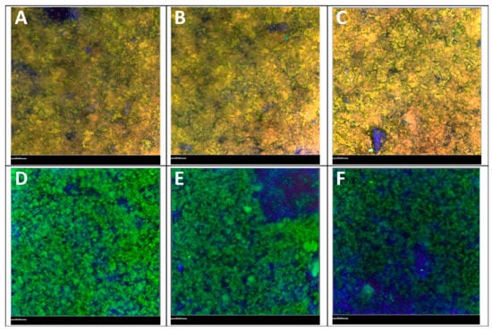 Fluorescence evaluation of nHAp materials with biofilms using confocal microscopy. The biofilm was a mixture of C. albicans, S. mutants, and L. rhamnosus strains cultured together on the material. The green colour indicates a live mixture of microorganisms. The blue colour represents the material surface. The top panel (A–C) is ethanol-treated mixed biofilm (control, mixture of live and dead microorganisms, visualized in yellow), and the bottom panel (D–F) is untreated mixed biofilm on the nHAp material. Three representative fields of view per condition are shown. Scale bar = 50 µm.