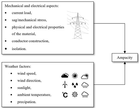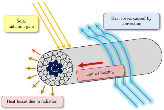 The minimum safe height of the conductors is determined in standards for various types of environments, which are designed for the most critical circumstances and with a high level of reliability [7,8]. The mentioned factors influencing the ampacity of the lines are described in Figure 1 [10].