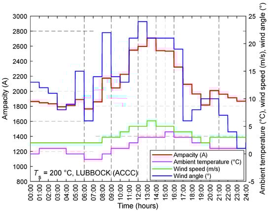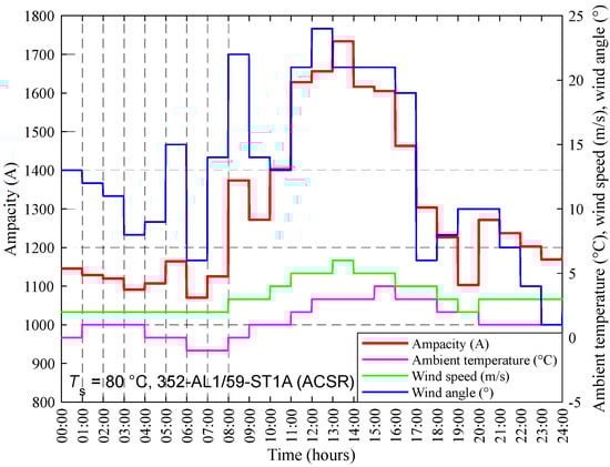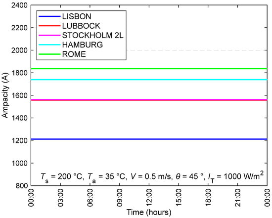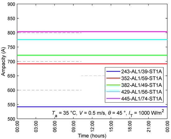 The static ampacity of the described conductors encompasses the conditions outlined in the referenced standards. As previously stated, this value remains constant throughout the entire period or year. To simplify matters, the static ampacity is presented for a 24 h interval, as depicted in Figure 3.