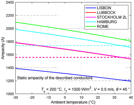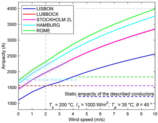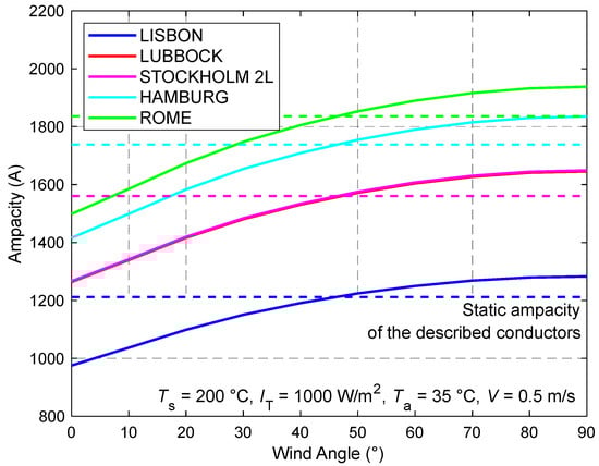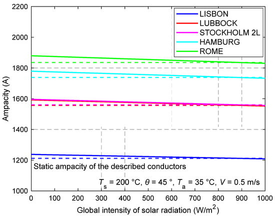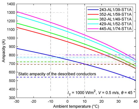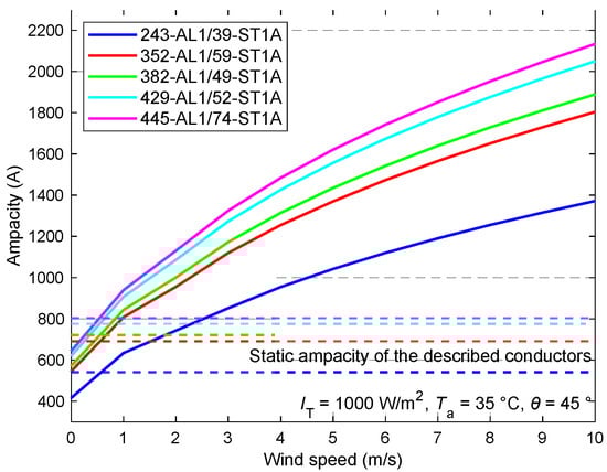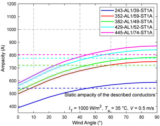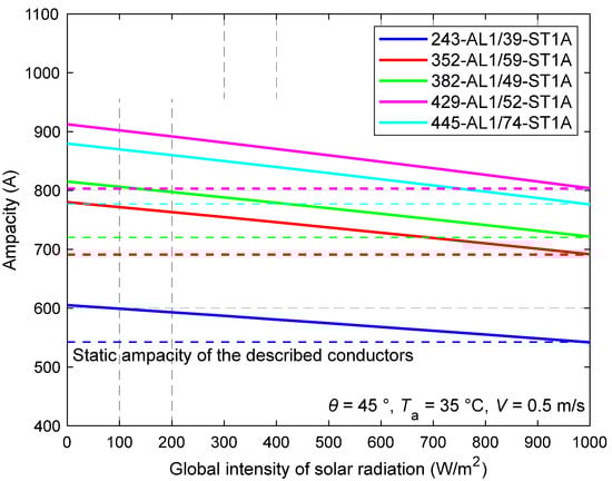 The final meteorological parameter regulated is the relationship between the maximum permissible current value of various ACSR conductor types and the intensity of solar radiation (Figure 7). The global intensity of solar radiation is inversely proportional to the ampacity. From the values used for the graphical dependency, it can be stated that DLR is advantageous 99% of the time.