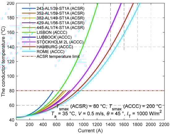 The assessment of ampacity differences between ACSR and ACCC conductors at temperatures Ts of 80 and 200 °C (numerical method).