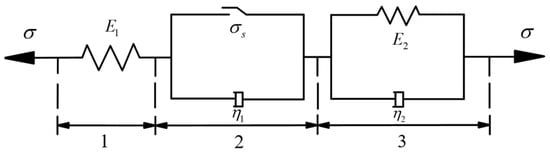 Experiments show that the deformation and creep rates of rocks vary under the coupled effect of varied chemical corrosion and temperature [44]. Notably, pH and temperature affect the creep model’s construction. Therefore, when constructing the creep model of rock under the coupled effect of varied chemical corrosion and temperature, it is necessary to consider the effect of pH and temperature on the rock’s creep rate. The Nishihara model can accurately describe the stages of primary creep and steady–state creep in rock. Figure 1 shows the Nishihara model.