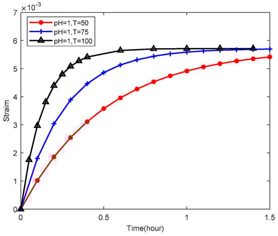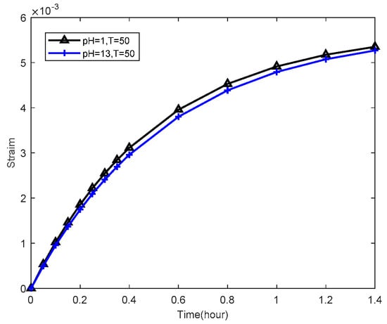 Figure 4 shows the effect of pH on the strain of the viscoelastic element at the same temperature. The figure shows that when other parameters are the same, the creep strain and rate of the viscoelastic element in an acidic environment exceed those in an alkaline environment.