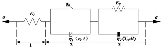 Figure 2 shows the viscoelastic element constructed in this study under the coupled effect of temperature and pH. Its composition is made up of elastic and viscous elements connected in series. According to the theory of the combined model, the stress expression of the viscoelastic element under the coupled action of temperature and pH is given as follows:
