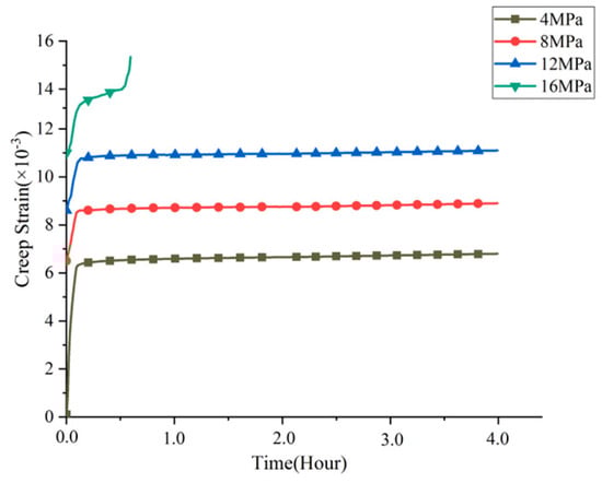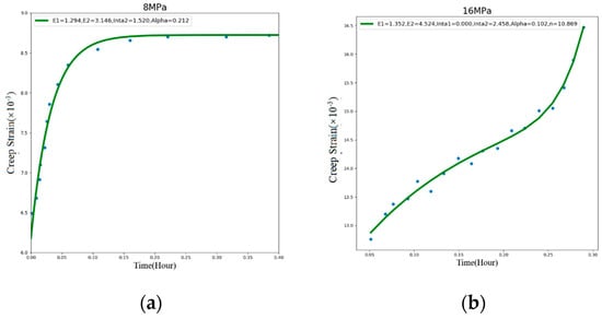 Because of time and space constraints, this study uses Python 3.10.2 software to verify the creep model by combining only a part of the creep data from sandstone soaked in alkaline solution at 100 °C (the creep test curve is shown in Figure 6). In this study, the creep curve when the axial pressure is 8 MPa is selected to verify the creep model when , and the creep curve when the axial pressure is 16 MPa is selected to verify the creep model when .