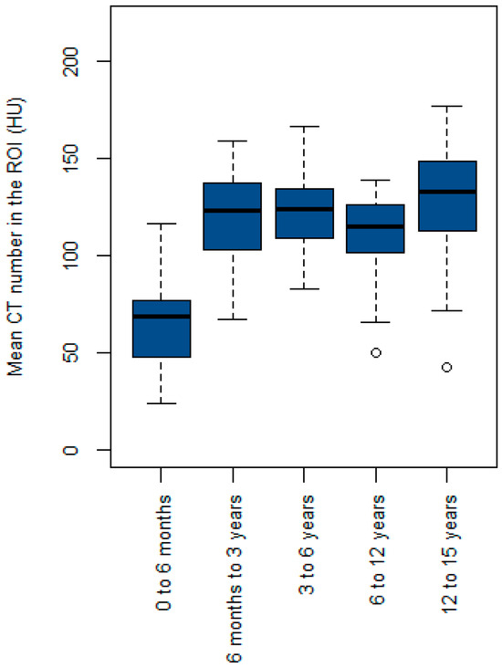 Figure 2 shows a box plot of the mean CT numbers within the ROI (HU) across the five age groups. The median value for the 0-to-6-month age group was lower than that of the other age groups. The median value for the 6-month-to-3-year age group was slightly lower than that for the 3-to-6-year age group. However, the median value for the 6-to-12-year age group was lower than that for the 6-month-to-3-year and 3-to-6-year age groups. The 12-to-15-year age group exhibited the highest median value of the mean CT number within the ROI.
