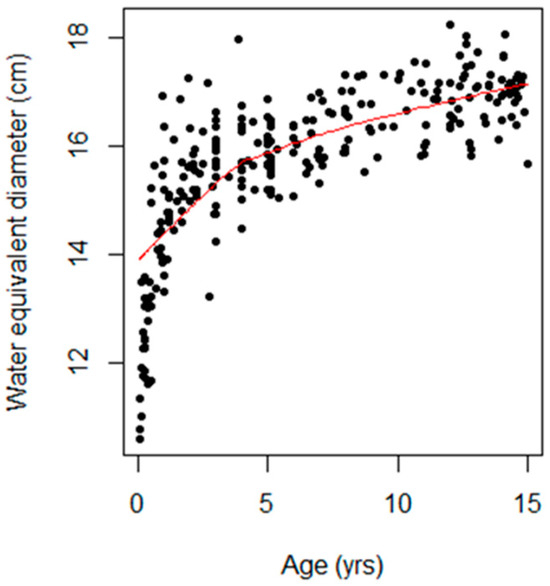 Figure 3 shows a scatterplot of the association between age and Dw, with the trend highlighted by a locally weighted scatterplot smoothing (LOWESS) curve shown as a red line. Noticeably, the Dw value was the lowest during early infancy and increased with age.