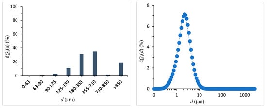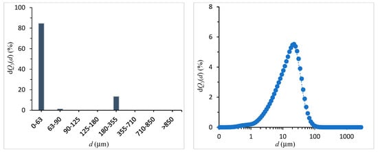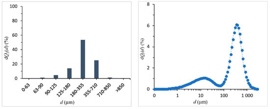 Figure 3 presents the particle size distribution of baby powder particles, as determined by the sieving method, and introduced as the differential distribution function dQ3(d).