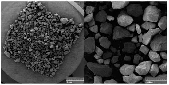Figure 8 shows SEM micrographs of the quartz sand sample. The particles vary in size, indicating a heterogeneous distribution. The particles appear mostly angular to sub-angular. The size variation is evident, with particles ranging from a few millimeters to sub-millimeter sizes, supporting the differential distribution curve’s indication of a wide size range. The higher magnification provides a closer look at individual particles. The angular nature of the particles is more pronounced, with sharp edges and irregular shapes.
