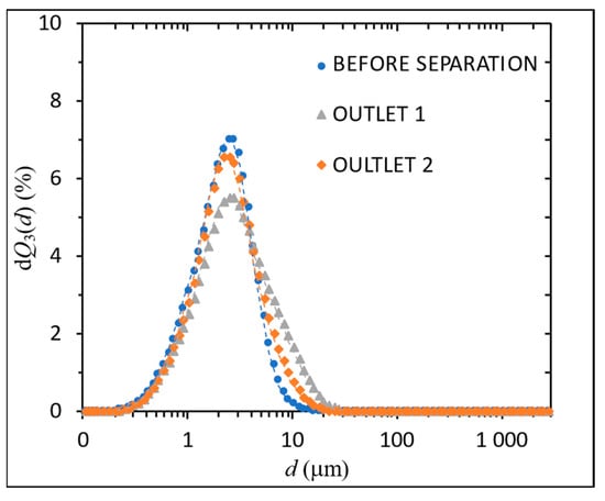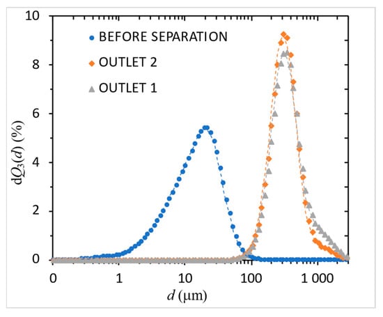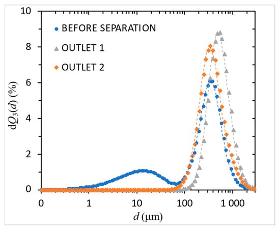 The modus diameter before separation was 20 μm, indicating a predominance of fine particles. Post-separation, Outlet 1 exhibited a dominant size of 352 μm, while Outlet 2 showed a modus diameter of 315 μm. This indicates that Outlet 1 predominantly contains slightly larger particles compared to Outlet 2. The significant difference in modes (352 μm vs. 315 μm) suggests that Outlet 1 is more effective in capturing the bigger particles, while Outlet 2 retains slightly smaller particles on average.