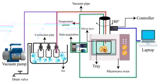 A pilot-scale MV dryer (Panasonic NN-SD28HS, Tokyo, Japan) with a microwave capacity from 100 to 600 W operated at 2.15 GHz and a vacuum pump (Lanphan 2XZ-4, Zhengzhou, China) was used for drying the apple samples. The samples were placed as a single layer in a thin tray that was attached to polypropylene (on the top of the microwave chamber). In the preliminary trial, the microwave power was set to 100, 270 and 300 W to prevent overheating. Also, the system was equipped with a temperature controller that automatically adjusted the power to attain specified temperatures. Moreover, the vacuum section line was connected to the rotary system. Silicon dioxide gel was used to absorb the water vapor throughout the vacuum line. A needle valve was utilized to regulate the absolute pressure to 5 kPa. Furthermore, to increase the performance of the vacuum, the water storage tank connections were filled with ice (Figure 1).